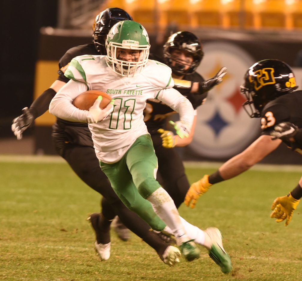 Rayquin Glover maneuvers his way downfield after avoiding TJ tacklers. He rushed for 13 yards and caught two passes for 33 yards in South Fayette’s win in the WPIAL final.