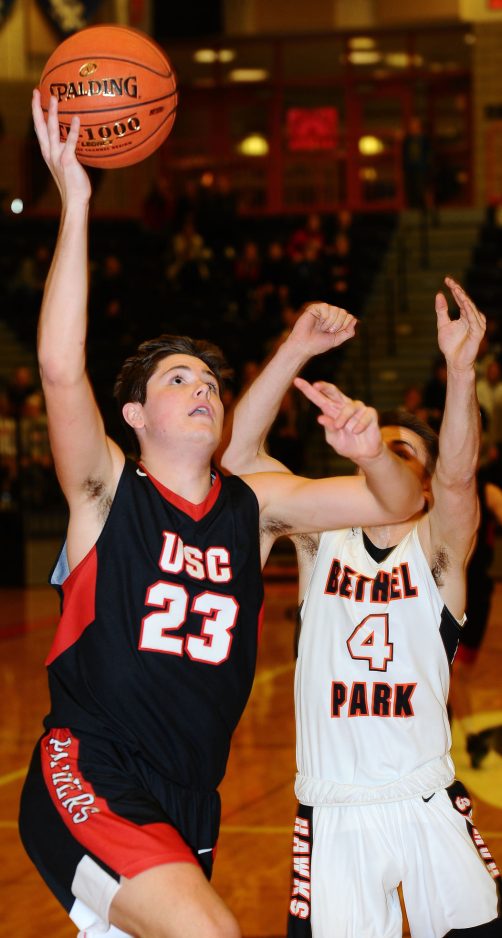 Chris Pantelis soars above defenders and drains a bucket during Upper St. Clair's 68-64 triumph against rival Bethel Park.