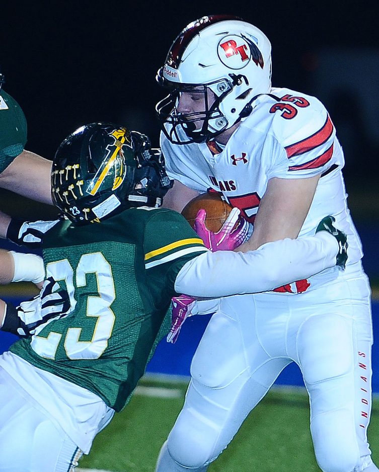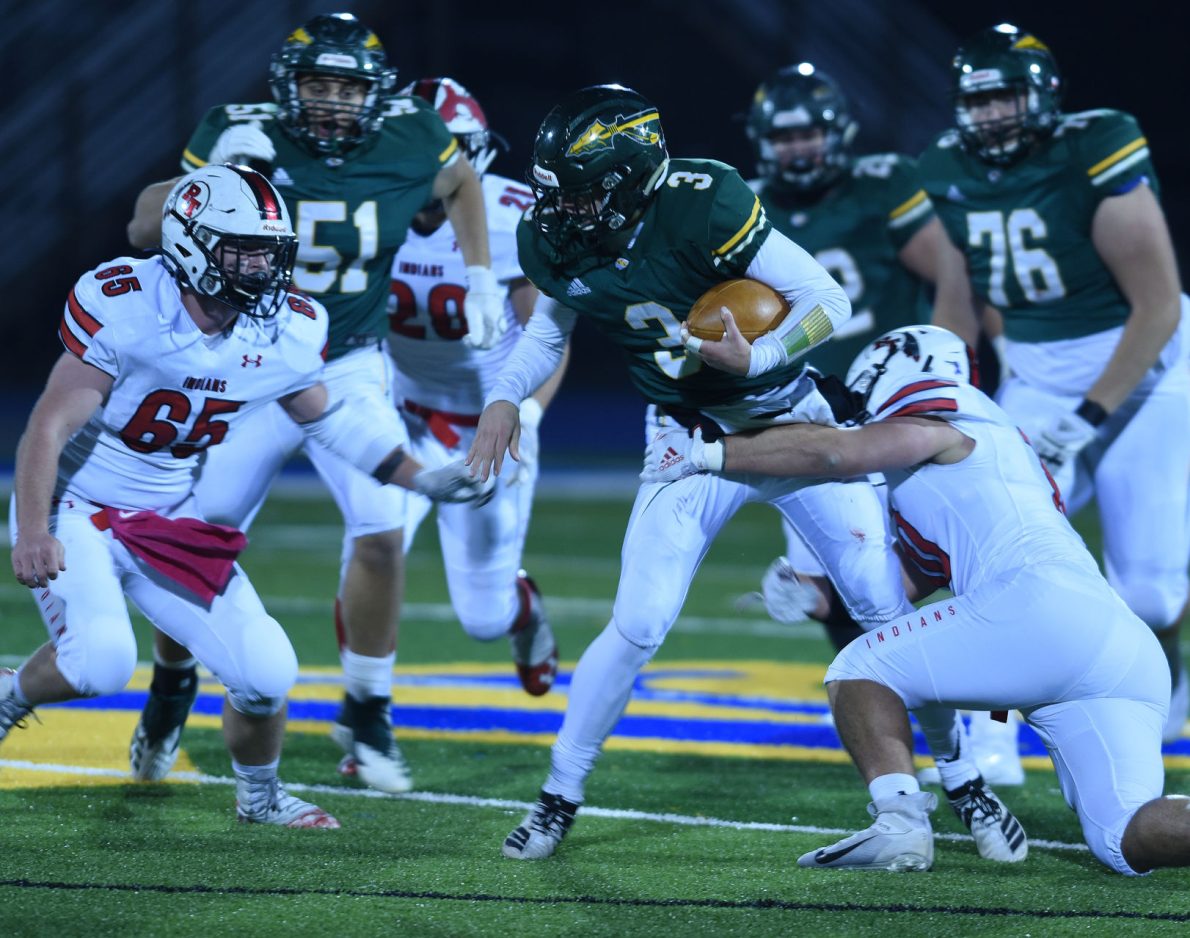 Penn-Trafford’s duo of Gabe Dulap and Ethan Carr teamed up for a 13-yard touchdown to trim the Indians’ lead. Dunlap, who had rushed and passed for more than 1,000 yards this season, finished with 11 completions on 24 attempts for 161 yards. Carr caught nine of those passes for 124 yards.
