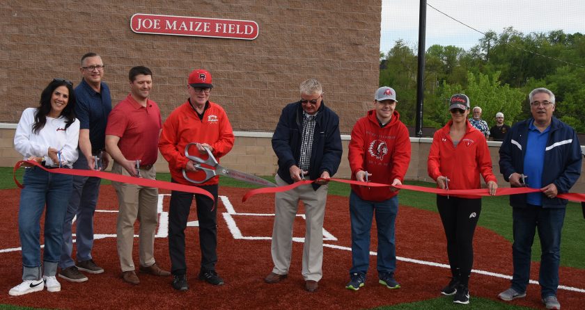 Joe Maize, fourth from left, and a host of dignitaries from the Peters Township School District, Council, Parks and Recreation as well as state representative Natalie Mehalik cut the ribbon May 5th on the newly named Joe Maize Field in Peterswood Park. The refurbished baseball field features a ...