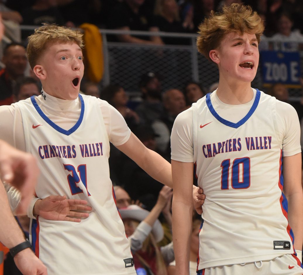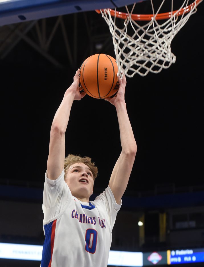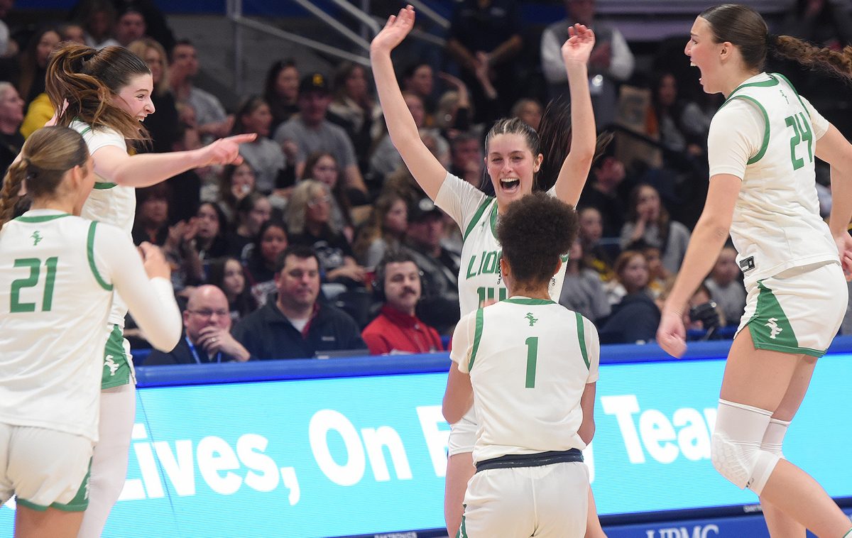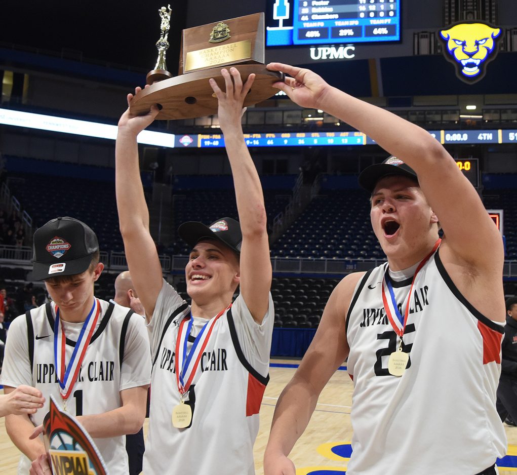 Upper St. Clair, Chartiers Valley and South Fayette flexed their muscles during the WPIAL championships held Feb. 27-28 at the Petersen Events Center on the University of Pittsburgh campus. By slipping past New Castle, 52-51, the Panthers became the first WPIAL team to win three championships in a row in the highest classification. In helping USC win its sixth district banner overall, Ryan Robbins led the way with 18 points, 11 rebounds and two blocked shots. Luke Marchinsky and Jake Foster followed, pitching in 14 and 11 tallies. Those three team captains (1) from left Marchinsky, Foster and Robbins hoisted the championship trophy after the victory. South Fayette’s starting five (2) from left Ella Vierra, Haylie Lamonde, Juliette Leroux, Lailah Wright and Ryan Oldaker jump for joy after dispatching Thomas Jefferson, 57-38, as the buzzer sounds in the WPIAL Class 5A girls final. Lamonde led the way with 19 points followed by 14 tallies each by Leroux and Wright. Oldaker, who finished with nine points, led in rebounding with eight boards. Evan Rou (left) and Silas Verzich (right) (3) react to the wow moment provided by Luca Feredico’s dunk (4) during Chartiers Valley’s triumph over Thomas Jefferson, 63-37, in the Class 5A boys final. Feredico exploded for 31 points, 8 rebounds and three steals in the Colts’ victory. Julian Semplice pitched in 15 tallies for CV. Jake Foster (5) sums up the emotions of all the champions who participated in the madness that is the WPIAL basketball championships. All three teams embarked on quests for PIAA titles March 6-7. The Lady Lions are the defending Class 5A state champions while USC and CV both reached the semifinals in 2025.